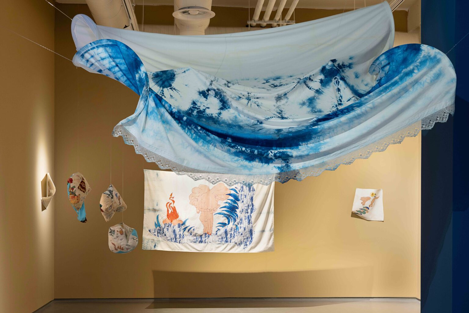 Karin Barad’a göre, madde pasif bir yüzey değil, etkileyen ve dönüştüren aktif bir bileşendir. İlkin’in sergisindeki kumaş, iplik, taş, kum ve mekân ise anlamın üretildiği ilişkisel alanlara dönüşüyor. Malzemelerin simgesel okumaları askıya alınırken, kumaş ve taşın eylemliliği düşünceyi harekete geçiriyor. Maddenin neyi gösterdiği değil, ne yaptığı üzerine odaklanıyor.