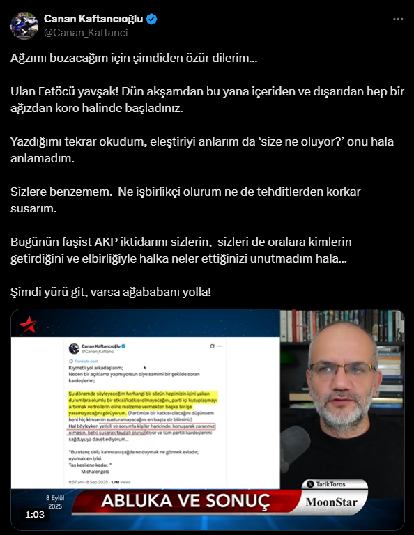 Kaftancıoğlu, paylaşımını Gürsel Tekin’e karşı pozisyon almadığı gerekçesiyle eleştiren firari FETÖ’cü Tarık Toros hakkında sert ifadeler kullandı.