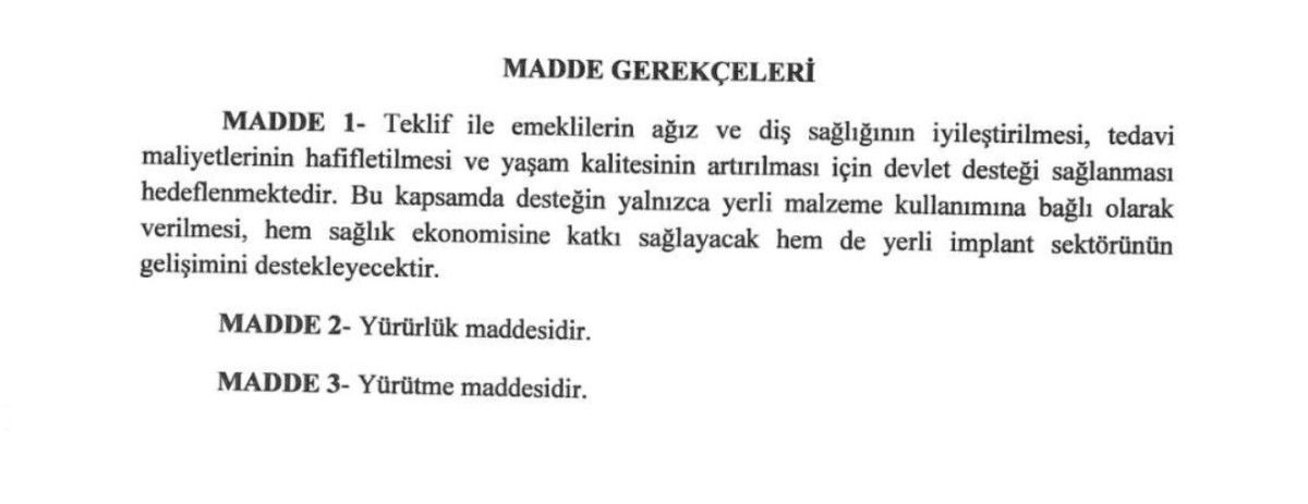 MHP olarak TBMM’ye sunduğumuz kanun teklifi ile başta emeklilerimizin durumunu düşünerek tüm vatandaşlarımız için ağız ve diş sağlığı kapsamında ihtiyaç duydukları “İMPLANT TEDAVİSİ” için yerli üretim ve en fazla 4 adet olmak üzere yapılacak tüm uygulamaların Sosyal Sigortalar Kurumu tarafından karşılanmasını önerdik.”