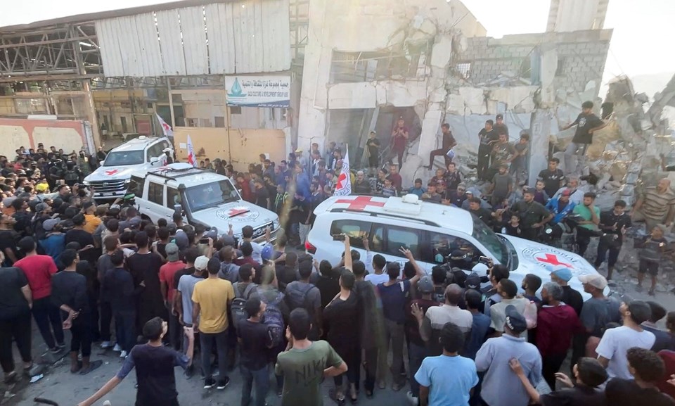 Kızılhaç araçları Han Yunus’ta İsrailli rehineleri almak için bekliyor.