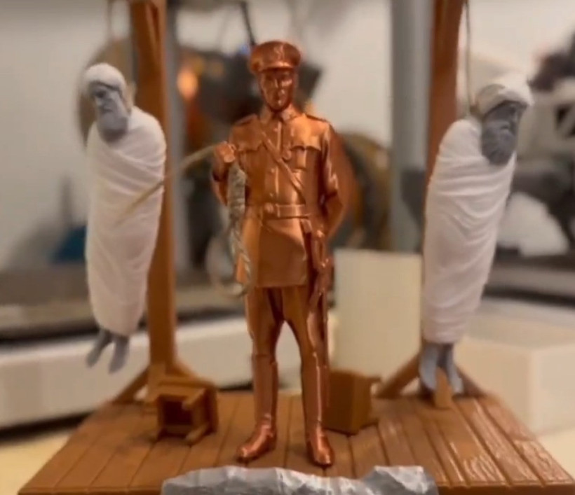 Heykeltraş Katfar, 1925 yılında genç cumhuriyete isyan ederek onlarca Türk askerinin şehit olmasına sebep olan Şeyh Said isyanının elebaşı Şeyh Said’in idam anını betimleyen araba kokuları ve heykeller üretip satışa sunmasıyla tanınıyor. İşte o ürün: