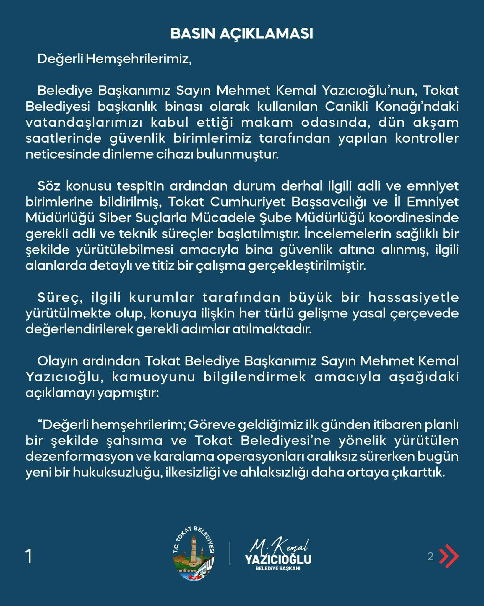 Dinleme cihazının tespiti ile gerekli olay yeri inceleme işlemleri yapılmış ve Cumhuriyet Başsavcılığınca soruşturma işlemlerine başlanılmıştır. Bu hayâsız saldırının arkasında kim olursa olsun adalet önünde hesap verecektir. Tokat Belediyesi, Gazi Mustafa Kemal Atatürk’ün emanet ettiği Cumhuriyet’e ve Türk milletinin değerlerine bağlı kalarak, şeffaf, açık ve doğru bildiklerinden taviz vermeden yoluna devam edecektir.”