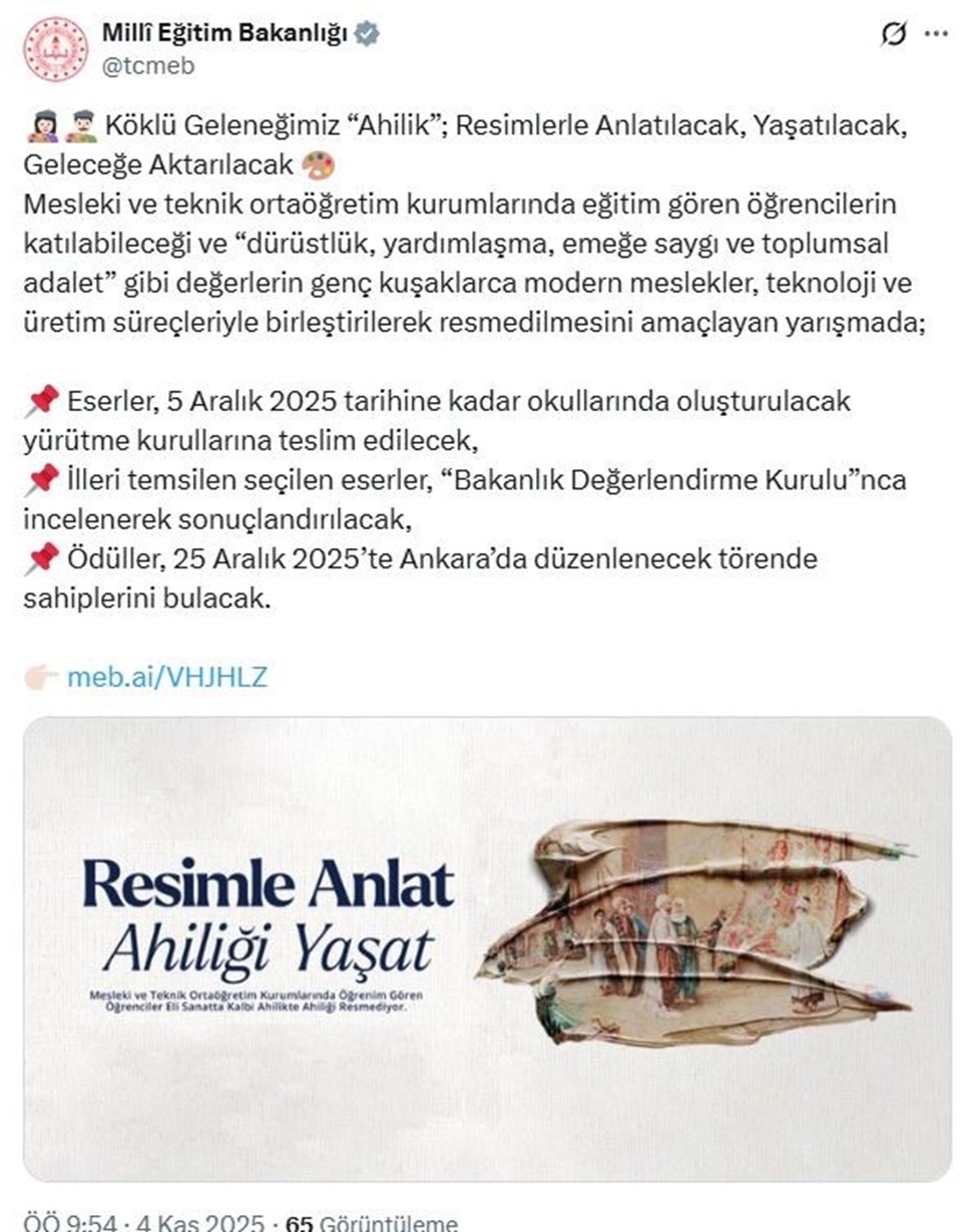 Milli Eğitim Bakanlığı “”Resimle Anlat, Ahiliği Yaşat” konulu resim yarışmasıyla ilgili bilgilendirmede bulundu. Öğrenciler yarışmaya gönüllülük esasına göre ve ücretsiz katılabilecek. Her öğrenci yalnızca bir eserle yarışmaya başvurabilecek. Yarışmaya katılmak isteyen öğrenciler, çalışmalarını 5 Aralık 2025 tarihine kadar okullarında oluşturulacak yürütme kurullarına teslim edecek.