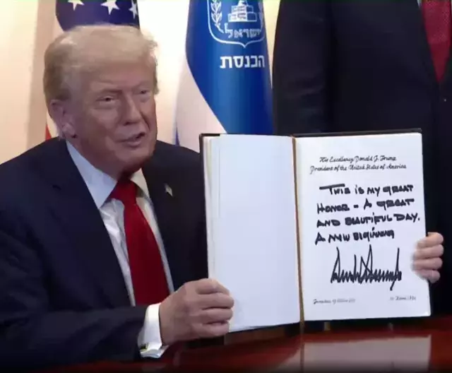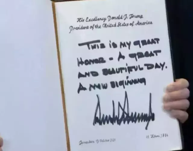 ABD Başkanı Donald Trump, Gazze’deki Mısır zirvesi öncesinde ziyaret ettiği İsrail’de Meclis’i ziyaret etti. Burada konuşma yapacak olan Trump, Meclis defterine “Çok güzel bir gün, büyük onur. Bu yeni bir başlangıç” ifadelerini yazdı.